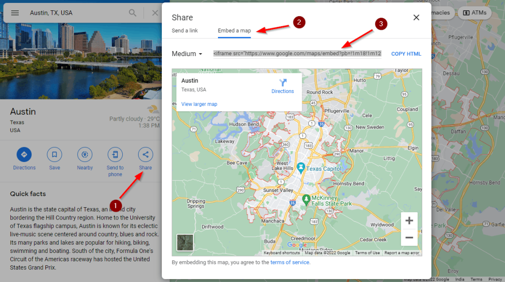 Screenshot: The ‘Embed a map’ tab in Google Maps sharing options.