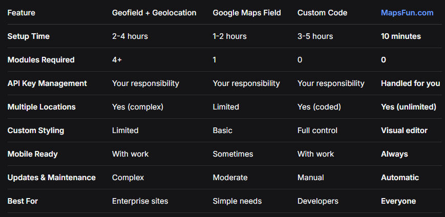 While Drupal offers powerful mapping capabilities through modules like Geofield and Geolocation, the implementation requires significant technical expertise—from module configuration and API management to complex view setups and performance optimization. For many Drupal site owners, this overhead outweighs the benefits.